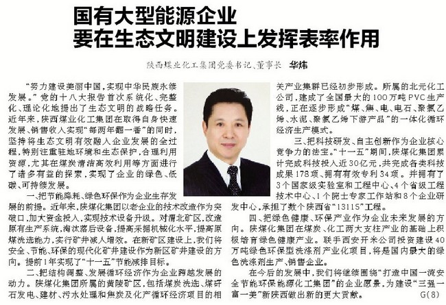 “努力建設(shè)美麗中國,實(shí)現(xiàn)中華民族永續(xù)發(fā)展?!秉h的十八大報(bào)告首次系統(tǒng)化、完整化、理論化地提出了生態(tài)文明的戰(zhàn)略任務(wù)。近年來,陜西煤業(yè)化工集團(tuán)在取得自身快速發(fā)展、銷售收入實(shí)現(xiàn)“每兩年翻一番”的同時(shí),堅(jiān)持將生態(tài)文明有效融入企業(yè)發(fā)展的全過程,特別注重駐地環(huán)境和生態(tài)保護(hù),合理利用資源,尤其在煤炭清潔高效利用等方面進(jìn)行了諸多有益的探索,實(shí)現(xiàn)了企業(yè)的綠色、低碳、可持續(xù)發(fā)展。