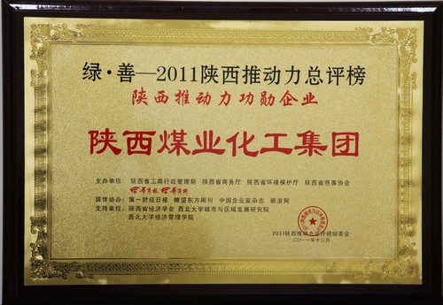 繼連續(xù)兩年獲評(píng)“2009陜西經(jīng)濟(jì)最具推動(dòng)力企業(yè)”和“2010陜西經(jīng)濟(jì)最具社會(huì)責(zé)任企業(yè)”后,陜西煤業(yè)化工集團(tuán)公司憑借2011年在經(jīng)營(yíng)業(yè)績(jī)上的強(qiáng)勢(shì)表現(xiàn)以及對(duì)陜西經(jīng)濟(jì)的強(qiáng)勢(shì)推動(dòng)又一次引發(fā)社會(huì)關(guān)注,連續(xù)第三次榮登陜西經(jīng)濟(jì)推動(dòng)力總評(píng)榜,獲評(píng)“2011陜西推動(dòng)力功勛企業(yè)”獎(jiǎng)。