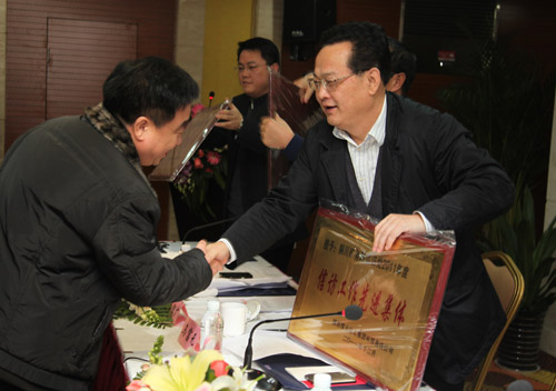 與會領導為獲得集團公司2011年信訪穩(wěn)定工作先進集體的單位頒發(fā)獎牌