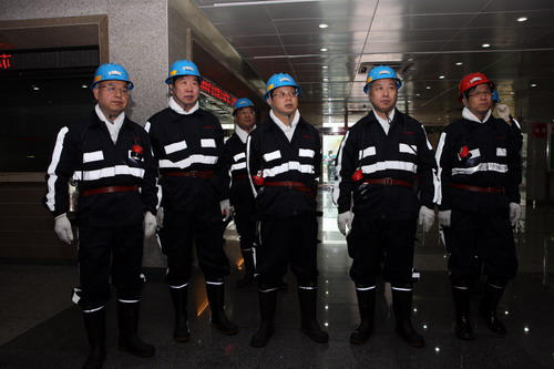 省國資委黨委書記周玉明、副主任王浩生一行在神南礦業(yè)公司紅柳林煤礦下井前接受安全培訓(xùn)