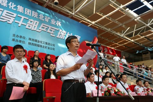 開(kāi)幕式在雄壯的《中華人民共和國(guó)國(guó)歌》中開(kāi)始。集團(tuán)公司黨委副書(shū)記、工會(huì)主席馬富元致開(kāi)幕詞。馬富元指出,剛剛過(guò)去的“十一五”,集團(tuán)公司綜合實(shí)力顯著增強(qiáng),產(chǎn)業(yè)體系日益完善,社會(huì)事業(yè)蓬勃發(fā)展,黨的建設(shè)深入推進(jìn),職工生活持續(xù)改善,幸福指數(shù)不斷提升,實(shí)現(xiàn)了“十一五”圓滿(mǎn)收官。尤其是2010年,集團(tuán)公司煤炭產(chǎn)銷(xiāo)雙雙突破億噸大關(guān),銷(xiāo)售收入561億元,利稅178億元,利潤(rùn)105億元,成為陜西省企業(yè)第一。今年是集團(tuán)“十二五”開(kāi)局之年,上半年集團(tuán)各項(xiàng)經(jīng)濟(jì)指標(biāo)再創(chuàng)歷史新高,再次位居全省第一。其中,1-6月份煤炭生產(chǎn)5229萬(wàn)噸,同比增長(zhǎng)16.9%;化工產(chǎn)品301萬(wàn)噸,同比增長(zhǎng)62.7%;實(shí)現(xiàn)銷(xiāo)售收入336.82億元,利潤(rùn)50.2億元,同比分別增長(zhǎng)49.3%和94.2%。還先后完成了科技板塊、后勤板塊、水泥板塊的整合,產(chǎn)業(yè)多元化和運(yùn)營(yíng)專(zhuān)業(yè)化的格局逐步呈現(xiàn)。在我們致力推動(dòng)經(jīng)濟(jì)社會(huì)又好又快發(fā)展的過(guò)程中,高度重視體育事業(yè)的全面發(fā)展,不斷滿(mǎn)足廣大干部職工日益增長(zhǎng)的體育文化需求,全集團(tuán)體育設(shè)施日益完善,全民健身運(yùn)動(dòng)蓬勃開(kāi)展。這些成績(jī)的取得值得驕傲和自豪,凝聚著集團(tuán)公司上下各級(jí)組織、各級(jí)領(lǐng)導(dǎo)、廣大職工的辛勤汗水和艱苦付出,也體現(xiàn)了集團(tuán)公司上下各級(jí)領(lǐng)導(dǎo)干部引領(lǐng)企業(yè)發(fā)展的卓越領(lǐng)導(dǎo)力,也充分證明了集團(tuán)公司上下的領(lǐng)導(dǎo)干部隊(duì)伍是一支能征善戰(zhàn)的強(qiáng)大團(tuán)隊(duì)。今天,我們精心組織舉辦這次“陜北礦業(yè)杯”領(lǐng)導(dǎo)干部乒乓球比賽,目的就是通過(guò)開(kāi)展有益身心的健身體育運(yùn)動(dòng),進(jìn)一步弘揚(yáng)銳意進(jìn)取、追求卓越的企業(yè)精神,倡導(dǎo)健康生活方式,推動(dòng)全民健身運(yùn)動(dòng)的深入開(kāi)展,展示陜煤化人的嶄新風(fēng)貌,切實(shí)增強(qiáng)領(lǐng)導(dǎo)干部隊(duì)伍的凝聚力、向心力和戰(zhàn)斗力,激發(fā)各級(jí)領(lǐng)導(dǎo)干部昂揚(yáng)的斗志、飽滿(mǎn)的熱情,為建設(shè)中國(guó)一流安全節(jié)能環(huán)保能源化工企業(yè)做出新的更大的貢獻(xiàn)。