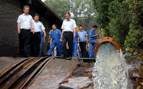 華煒董事長在桑樹坪礦5號(hào)、6號(hào)井排水口了解情況。