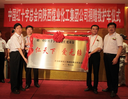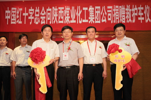 捐贈儀式上,中國紅十字基金會仁愛基金志愿者工作辦主任時進(jìn)龍和陜西煤業(yè)化工實業(yè)集團(tuán)公司領(lǐng)導(dǎo)進(jìn)行了捐贈救護(hù)車交接儀式。陜煤化集團(tuán)向中國紅十字基金會仁愛基金贈送了“仁天下,愛無疆”牌匾。
