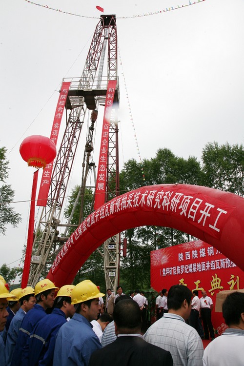 7月6日上午10時30分,冒著密集的雨滴,銅川礦業(yè)公司在下石節(jié)礦二號風(fēng)井隆重舉行《焦坪礦區(qū)侏羅紀(jì)煤層地面井組瓦斯預(yù)抽采技術(shù)研究與應(yīng)用》鉆井開工剪彩儀式。陜西煤業(yè)化工集團(tuán)公司副總經(jīng)理閔龍,銅川礦業(yè)公司總經(jīng)理宋志剛,公司黨委書記黃河,中煤科工集團(tuán)西安研究院院長董書寧、黨委書記王澤進(jìn),銅川礦業(yè)有限公司副總經(jīng)理、總工程師劉啟科、副總經(jīng)理封建利,中煤科工集團(tuán)西安研究院副院長張群、虎維岳,公司副總工程師以及公司調(diào)度室、財務(wù)部、機(jī)械動力部、宣傳部、行政辦公室、黨委辦公室、技術(shù)開發(fā)部等部室領(lǐng)導(dǎo)和中煤科工集團(tuán)西安研究院科研處、經(jīng)營處、生產(chǎn)處、黨委辦公室和地質(zhì)所等部門的領(lǐng)導(dǎo),銅川礦業(yè)公司下石節(jié)煤礦黨政領(lǐng)導(dǎo)、干部職工共200余人參加開工典禮。