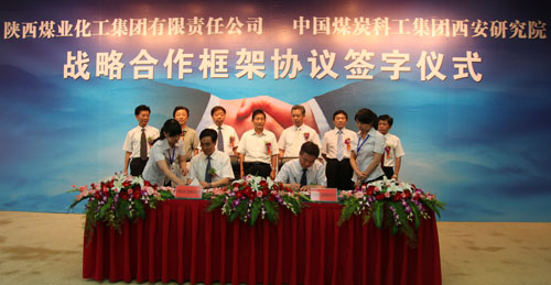 陜西煤業(yè)化工集團(tuán)公司副總經(jīng)理閔龍和中國煤炭科工集團(tuán)西安研究院副院長虎維岳分別代表雙方企業(yè)簽署戰(zhàn)略合作框架協(xié)議及防治水技術(shù)服務(wù)協(xié)議。