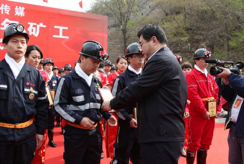 “我們倡議:把不斷學(xué)習(xí)作為一種精神追求,把不斷創(chuàng)新作為一個奮斗目標(biāo),把勤儉節(jié)約作為一種生活習(xí)慣,把安全生產(chǎn)作為一種自覺行為,把關(guān)愛生命作為一種社會責(zé)任……”4月22日,主題為“見證?長城?礦工”的頒牌活動在八達嶺水關(guān)長城舉行,與會領(lǐng)導(dǎo)為獲獎礦工頒獎,獲獎礦工代表宣讀了倡議書。4月23日清晨,百名優(yōu)秀青年礦工在天安門廣場觀看了升旗儀式,并進行了宣誓。隨后,在人民大會堂舉行百名優(yōu)秀青年礦工群雕式新聞發(fā)布儀式?!斑@是光榮與夢想的交響,這是570萬礦工的驕傲”,當(dāng)人民大會堂新聞發(fā)布廳雄渾的音樂響起,燈光漸暗,礦燈齊明,礦工們閃耀亮相。