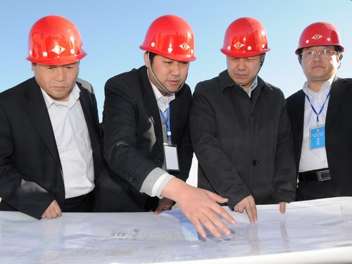 華煒董事長(zhǎng)(左一)在奧維乾元公司施工現(xiàn)場(chǎng)了解工程進(jìn)展情況。
