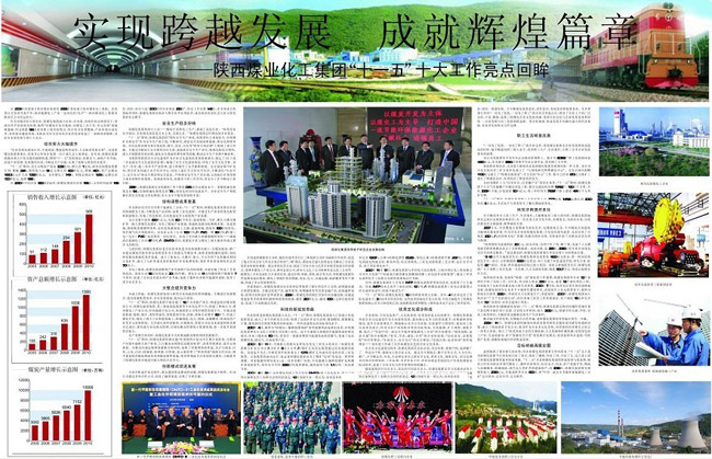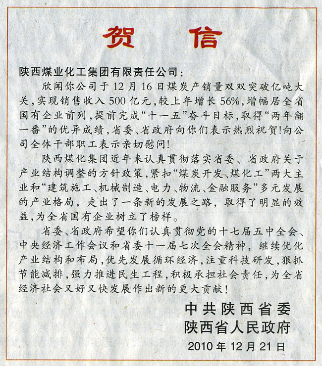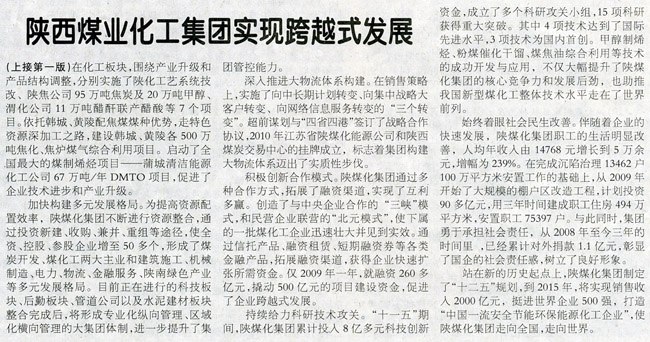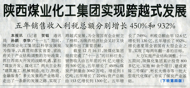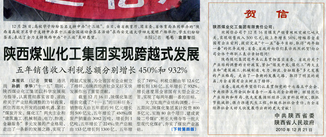 繼12月17日,陜西日?qǐng)?bào)一版報(bào)眼發(fā)表《陜煤化集團(tuán)煤炭產(chǎn)銷(xiāo)雙雙突破億噸大關(guān)——實(shí)現(xiàn)銷(xiāo)售收入500億,增幅居全省國(guó)企前列》報(bào)道之后,今日,陜西日?qǐng)?bào)再次在一版顯著位置發(fā)表《陜西煤業(yè)化工集團(tuán)實(shí)現(xiàn)跨越式發(fā)展——五年銷(xiāo)售收入利稅總額分別增長(zhǎng)450%和932%》,和中共陜西省委、陜西省人民政府祝賀陜西煤業(yè)化工集團(tuán)實(shí)現(xiàn)“十一五”奮斗目標(biāo)的賀信,并在該報(bào)20-21通版以《實(shí)現(xiàn)跨越發(fā)展 成就輝煌篇章——陜西煤業(yè)化工集團(tuán)“十一五”十大工作亮點(diǎn)回眸》進(jìn)行了深度報(bào)道。