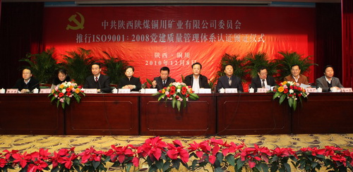 歷經(jīng)8 個(gè)月的工作,于12月8日上午,銅川礦業(yè)有限公司委員會(huì)黨建工作質(zhì)量管理體系順利通過(guò)了北京新世紀(jì)認(rèn)證有限公司現(xiàn)場(chǎng)審定,并取得認(rèn)證書(shū)。這是陜西省國(guó)有企業(yè)首家取得ISO9000質(zhì)量管理體系認(rèn)證的單位。省國(guó)資委黨委副書(shū)記、紀(jì)委書(shū)記高新華,陜煤化集團(tuán)黨委副書(shū)記馬富元、黨群工作部部長(zhǎng)夏迎廣及銅川市和銅川礦業(yè)公司相關(guān)領(lǐng)導(dǎo)和人員共160余人參加了認(rèn)證頒證儀式。銅川礦業(yè)公司黨委書(shū)記杜樹(shù)山主持認(rèn)證頒證儀式。
