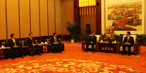 山西省委常委、常務(wù)副省長李小鵬(右一)會見陜西省副省長吳登昌(右二)和陜煤化集團(tuán)公司領(lǐng)導(dǎo)