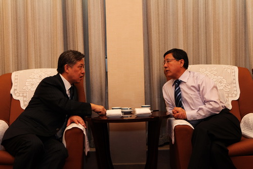 吳登昌副省長(右一)在簽約儀式前會見陜煤化集團(tuán)董事長華煒
