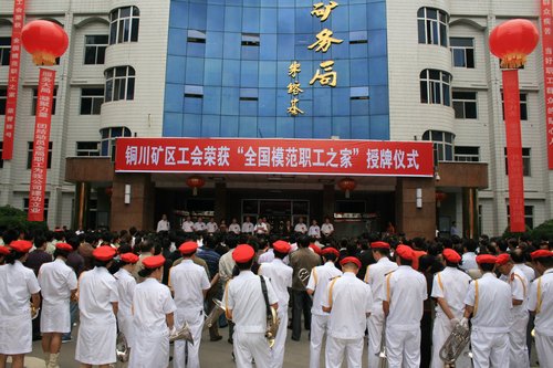 8月25日上午,銅川礦業(yè)公司機(jī)關(guān)辦公大院,鑼鼓喧天,軍樂陣陣,鞭炮齊鳴,彩虹門、紅地毯和數(shù)條巨幅標(biāo)語相映成輝。上午10時許,銅川礦區(qū)工會榮獲“全國模范職工之家”榮譽(yù)稱號授牌儀式在這里隆重舉行。