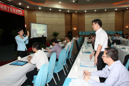 為進(jìn)一步提高廣大員工的禮貌禮儀、行為規(guī)范和服務(wù)意識,提升公司形象和競爭實(shí)力。5月27日,陜煤股份公司在雍村飯店舉辦了員工禮儀培訓(xùn)班,特邀西安華夏禮儀網(wǎng)高級禮儀培訓(xùn)師楊揚(yáng)主講。股份公司全體員工及集團(tuán)公司部分員工共計(jì)50余人參加了培訓(xùn)。