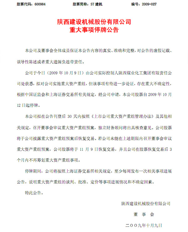 10月9日,陜西建設(shè)機(jī)械股份有限公司發(fā)布重大事項(xiàng)停牌公告,全文如下。