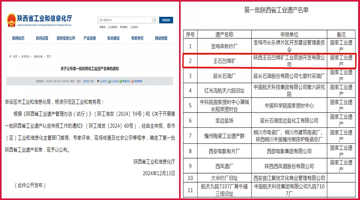 近日,陜西省工業(yè)和信息化廳公布了第一批陜西省工業(yè)遺產(chǎn)名單,公司王石凹煤礦憑借其獨特的歷史價值、社會價值和獨特的工業(yè)景觀入圍名單。