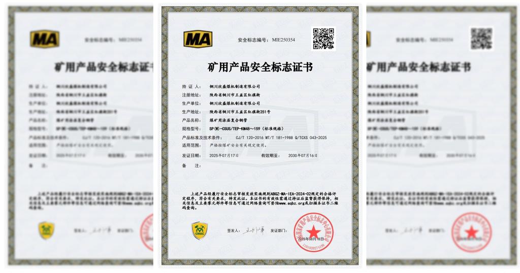 近日,銅川欣盛煤機(jī)制造有限公司順利通過(guò)安標(biāo)國(guó)家礦用產(chǎn)品安全標(biāo)志中心監(jiān)督評(píng)審,獲得了“煤礦用涂層復(fù)合鋼管礦用產(chǎn)品安全標(biāo)志證書(shū)”,為提升企業(yè)市場(chǎng)競(jìng)爭(zhēng)力再添砝碼。