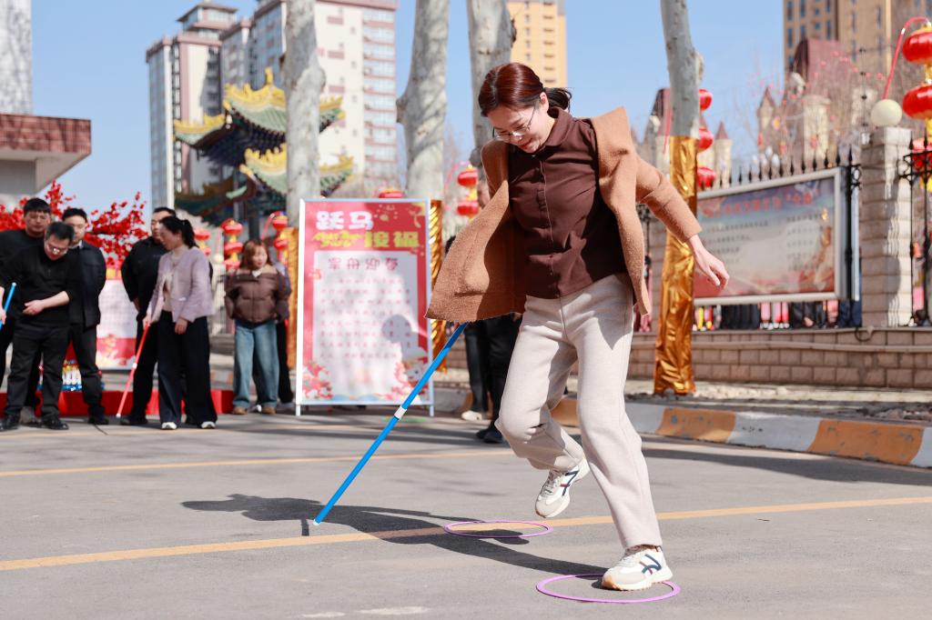 “福繩引路·鳴鑼納福”活動(dòng)中,要求隊(duì)員將道具置于兩腿中間平穩(wěn)前行,抵達(dá)終點(diǎn)敲鑼祈福,考驗(yàn)身體協(xié)調(diào)性與專(zhuān)注力;大家小心翼翼又滿懷笑意地奔赴終點(diǎn),抵達(dá)后奮力敲響銅鑼?zhuān)宕嗪榱恋蔫屄曉⒁庵Q鑼納福、新春順?biāo)?,職工們?cè)趯?zhuān)注前行與祈福鳴鑼中,既感受著游戲的樂(lè)趣,又將新春的美好祈愿藏于心底,暖意融融。
