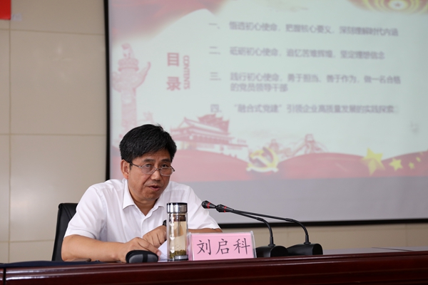 開班儀式結(jié)束后,劉啟科以《砥礪初心、勇?lián)姑窞轭},從“悟透初心使命,把握核心要義,深刻理解時代內(nèi)涵;砥礪初心使命,追憶苦難輝煌,堅定理想信念;踐行初心使命,勇于擔(dān)當(dāng)、善于作為,做一名合格的黨員領(lǐng)導(dǎo)干部;融合式黨建引領(lǐng)企業(yè)高質(zhì)量發(fā)展的實踐探索”五個方面,結(jié)合自己工作實際,通過詳實生動的案例,為學(xué)員帶來了一堂精彩的專題黨課。