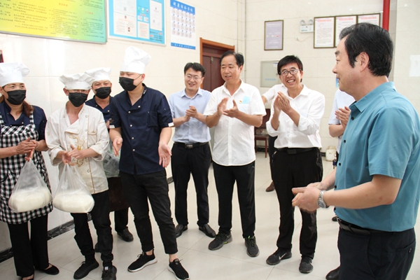 接著,劉水利一行來到北風井職工食堂,與干部職工親切地拉起家常。劉水利向食堂管理員說“職工食堂是小崗位,但有大作用,關系著職工的身體健康,你們要切實履職盡責,做好服務職工的后勤保障工作”。他同時告誡職工食堂的同志,當前抓好常態(tài)化疫情防控至關重要,你們在職工就餐時注重體溫檢測、強化衛(wèi)生保潔等舉措很好,要繼續(xù)堅持好各項疫情防控措施,切不可掉以輕心、不可有絲毫懈怠。希望你們繼續(xù)從源頭上抓好管控,進一步注意環(huán)境衛(wèi)生,保障飯菜質量,讓工友們從井下上來有可口的飯菜吃,有回家的感覺、安心的工作。劉水利還深情地對現(xiàn)場人員說:“食堂工作雖然是最普通的工作,但民以食為天,最普通的也是最光榮的。希望你們盡職工作,讓礦工們吃得好,吃得飽,多出煤,多出效益煤,努力把我們的各項工作搞好。”他同時向在職工食堂工作的職工送去防暑降溫品,并向這些為礦山建設貢獻力量的幕后英雄表示衷心的感謝。