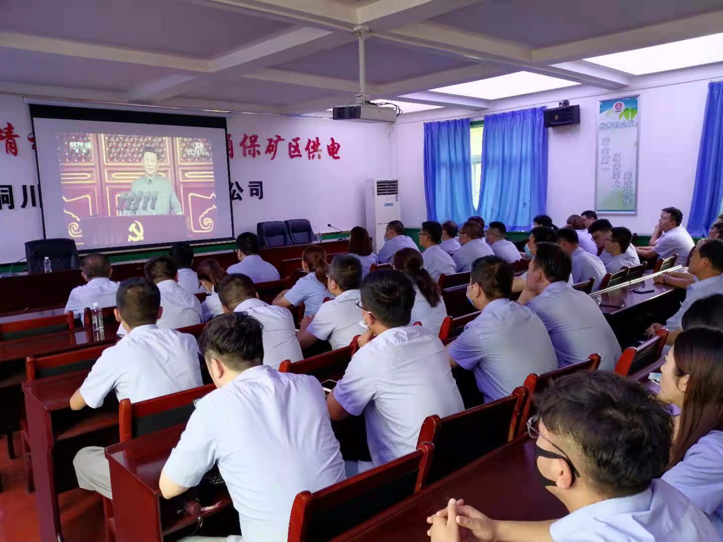 在徐家溝礦,黨員干部職工在社區(qū)項目管理中心會議室,著裝整齊,豪情滿懷,聚精會神集中收看盛大的慶祝大會直播。