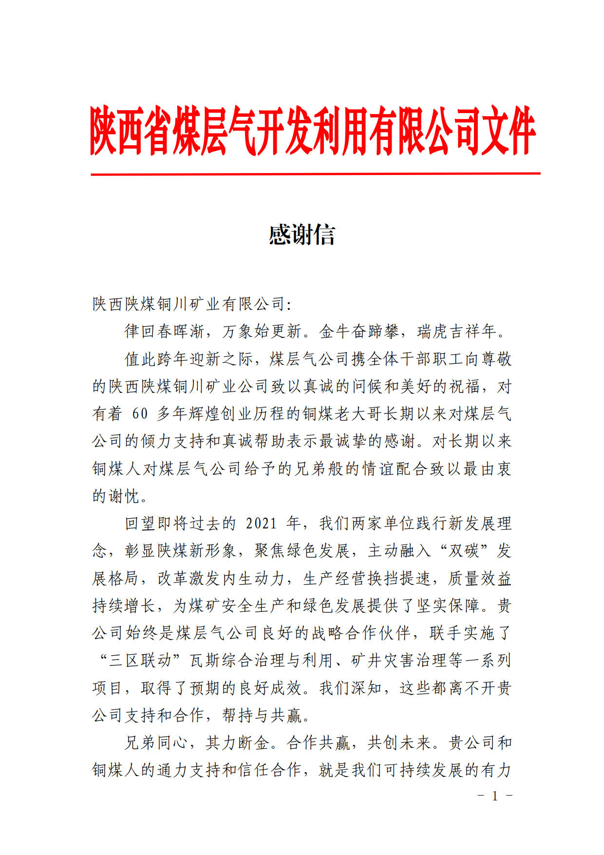 新年來(lái)臨之際,陜西煤層氣開(kāi)發(fā)利用有限公司向銅川礦業(yè)公司發(fā)來(lái)感謝信,對(duì)公司一直以來(lái)對(duì)陜西煤層氣公司改革發(fā)展給予的關(guān)注支持表示衷心的感謝,希望在新的一年雙方進(jìn)一步共同合作、攜手發(fā)展,為陜煤集團(tuán)爭(zhēng)創(chuàng)世界一流企業(yè)作出新貢獻(xiàn)。