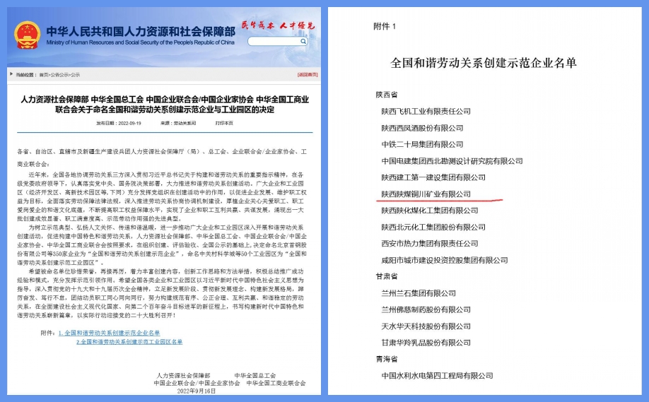 為樹立示范典型、弘揚人文關懷、傳遞和諧溫暖,進一步推動廣大企業(yè)和工業(yè)園區(qū)深入開展和諧勞動關系創(chuàng)建活動,促進構建中國特色和諧勞動關系,近日,人力資源社會保障部、中華全國總工會、中國企業(yè)聯(lián)合會/中國企業(yè)家協(xié)會、中華全國工商業(yè)聯(lián)合會共同發(fā)布了關于命名全國和諧勞動關系創(chuàng)建示范企業(yè)與工業(yè)園區(qū)的決定,其中公司榮列“全國和諧勞動關系創(chuàng)建示范企業(yè)”單位榜單,既是銅川市唯一上榜企業(yè),也是陜西企業(yè)中唯一上榜的煤炭企業(yè)。