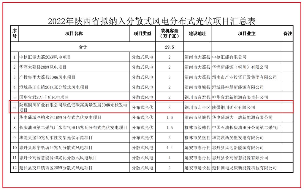 11月24日,公司50MWp光伏發(fā)電項(xiàng)目通過陜西省發(fā)改委光伏發(fā)電項(xiàng)目保障性并網(wǎng)規(guī)模競爭性配置評審,正式獲得批準(zhǔn)。此項(xiàng)目為2022年陜煤集團(tuán)所屬企業(yè)中,唯一通過省競爭性配置評審獲批的分布式光伏發(fā)電項(xiàng)目,標(biāo)志著公司在實(shí)現(xiàn)碳達(dá)峰、碳中和,加快推進(jìn)綠色低碳技術(shù)攻關(guān)和應(yīng)用,踐行生態(tài)文明理念、推進(jìn)實(shí)現(xiàn)生態(tài)環(huán)境保護(hù)和企業(yè)高質(zhì)量發(fā)展邁出堅(jiān)實(shí)的一步。