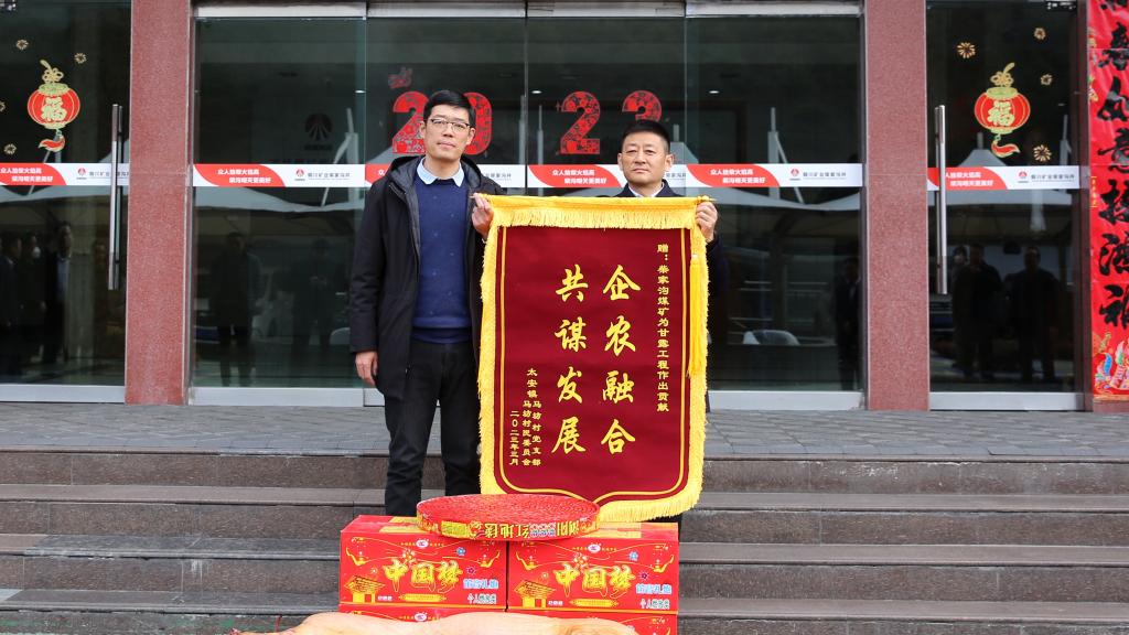 為表感謝,太安鎮(zhèn)馬坊村黨支部、村民委員會為感謝該礦為甘露工程作出的突出貢獻(xiàn),讓太安鎮(zhèn)群眾的生活用水更潔凈,送來了一面“企農(nóng)融合 共謀發(fā)展”的錦旗,及一整頭豬肉,以此表達(dá)對該礦真情助力鄉(xiāng)村振興的謝意。
