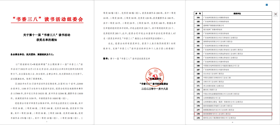 第十一屆“書香三八”讀書活動以“閱讀新時代 鑄就新輝煌”為主題,由紅旗出版社、“書香三八”讀書活動組委會共同舉辦,來自全國31個省市22000余家單位、1100多萬女性參與本屆讀書活動,陜煤集團(tuán)共40篇作品獲獎,其中公司有10篇作品榜上有名,分獲二等獎1篇,優(yōu)秀獎9篇。