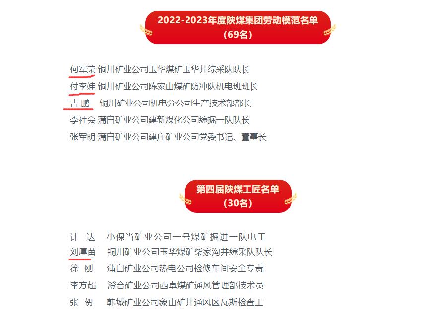 4月23日,陜煤集團召開2022-2023年度文明單位暨勞動模范、陜煤工匠表彰大會,公司玉華煤礦被評為陜煤集團文明單位,公司員工何軍榮、付李娃、吉鵬榮獲陜煤集團勞動模范稱號,公司員工劉厚苗被授予第四屆陜煤工匠稱號。
