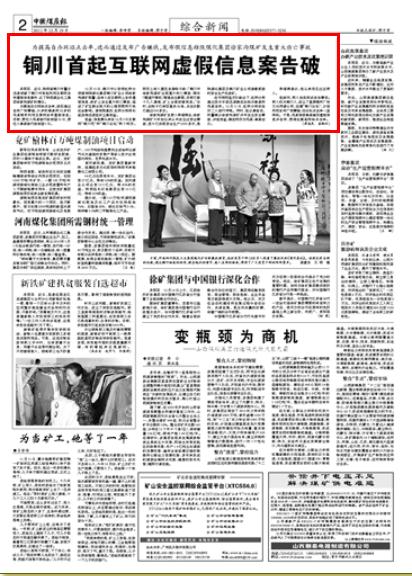 本報(bào)訊近日,陜西省銅川市警方迅速偵破了銅川市首起利用互聯(lián)網(wǎng)發(fā)布虛假信息案件,還了陜西煤業(yè)化工集團(tuán)徐家溝煤礦的清白。