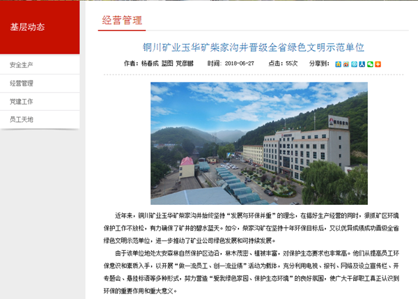 近年來,銅川礦業(yè)玉華礦柴家溝井始終堅持“發(fā)展與環(huán)保并重”的理念,在搞好生產(chǎn)經(jīng)營的同時,狠抓礦區(qū)環(huán)境保護(hù)工作不放松,有力確保了礦井的碧水藍(lán)天。如今,柴家溝礦在堅持十年環(huán)保目標(biāo)后,又以優(yōu)異成績成功晉級全省綠色文明示范單位,進(jìn)一步推動了礦業(yè)公司綠色發(fā)展和可持續(xù)發(fā)展。