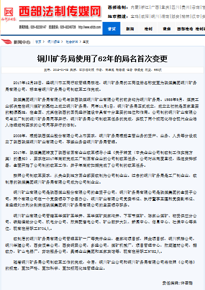 2017年12月28日,經(jīng)銅川市工商行政管理局核準,銅川礦務局的工商注冊名稱變更為陜煤集團銅川礦務局有限公司,標志著銅川礦務局公司制改革工作完成。