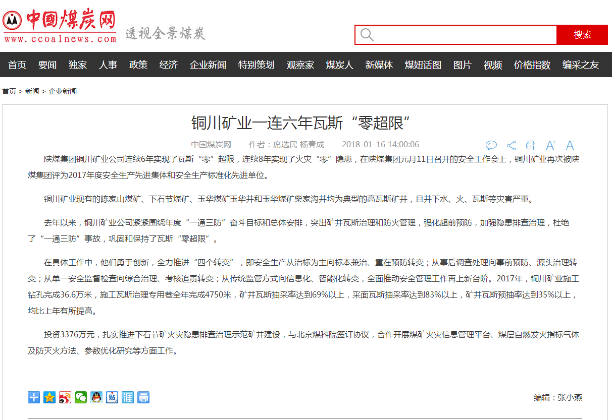 陜煤集團(tuán)銅川礦業(yè)公司連續(xù)6年實(shí)現(xiàn)了瓦斯“零”超限,連續(xù)8年實(shí)現(xiàn)了火災(zāi)“零”隱患,在陜煤集團(tuán)元月11日召開(kāi)的安全工作會(huì)上,銅川礦業(yè)再次被陜煤集團(tuán)評(píng)為2017年度安全生產(chǎn)先進(jìn)集體和安全生產(chǎn)標(biāo)準(zhǔn)化先進(jìn)單位。