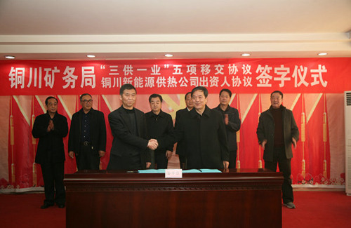 簽約儀式上,銅川礦務(wù)局和銅川華遠實業(yè)有限公司簽訂了“三供一業(yè)”五項移交協(xié)議;銅川礦務(wù)局和銅川市天然氣公司簽訂了“銅川新能源供熱有限公司”出資人協(xié)議和“銅川新能源供熱有限公司”公司章程,為下一步工作有序開展作了良好鋪墊。