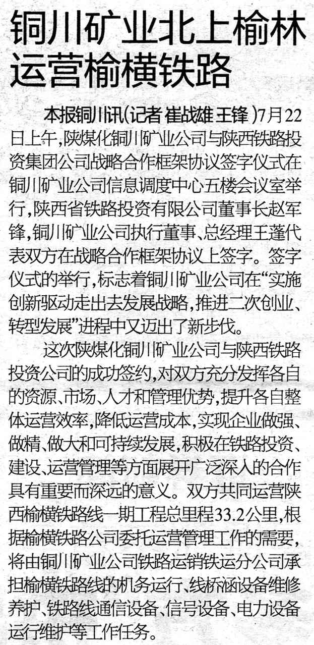 ★ 7月24日“中國(guó)煤炭報(bào)”刊發(fā)《銅川礦業(yè)公司參與運(yùn)營(yíng)榆橫鐵路》(作者:王鋒 席選民 郝龍)