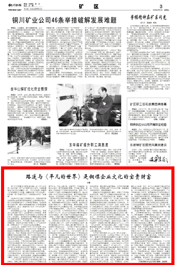對于銅川特別是銅川礦業(yè)公司(銅川礦務(wù)局),路遙掛職創(chuàng)作的過程,以及誕生于斯的《平凡的世界》,都是不可多得的極其寶貴的文化遺產(chǎn),它對企業(yè)文化建設(shè)具有特殊重要的意義。在路遙的積極影響下,我們的企業(yè)文化建設(shè)目標遠大而堅定,我們的職工文藝創(chuàng)作呈現(xiàn)持續(xù)繁榮,一大批文學創(chuàng)作人才和優(yōu)秀作品脫穎而出,涌現(xiàn)出了《礦長的上午》、《昨夜簫聲》等一批具有全省乃至全國影響的優(yōu)秀文學作品,各類中省市文學獎項層出不窮,涌現(xiàn)出了中國作家協(xié)會會員、銅川市作協(xié)主席黃衛(wèi)平,陜西省德藝雙馨優(yōu)秀作家、陜西煤化作協(xié)副主席楊治華,小說作家楊生武、輪椅詩人王鐵毛、煤炭詩人李祥云和李建榮,以及散文作家蘭阿利、曲藝作家黎樹文等一批文藝創(chuàng)作的骨干人物。這里,還產(chǎn)生了譽滿三秦、聲震全國的礦務(wù)局職工軍樂團,以及“銅煤歌會”這樣的著名文化品牌。另外,我們大力倡導職工通過讀書學習提高科學文化素質(zhì)和生產(chǎn)技能,造就了一支素質(zhì)優(yōu)良、作風過硬的職工隊伍。公司黨政提出要求:廣大干部每月讀一本好書,寫兩篇結(jié)合工作實際的理論文章,以提高文化素質(zhì)和思想政治水平,提高干事創(chuàng)業(yè)、克難攻堅的過硬本領(lǐng),提高愛崗敬業(yè)、忠于職守的職業(yè)操守,提高凝心聚力、不畏困難的堅強意志。百里礦區(qū),讀書學習蔚然成風,精神面貌煥然一新,工作成效明顯提高。在努力實施加快企業(yè)轉(zhuǎn)型發(fā)展、二次創(chuàng)業(yè)的進程中,干部職工識大體,顧大局,明大義,精誠團結(jié),努力作為,向著戰(zhàn)勝困難度嚴冬,建設(shè)強局再輝煌的目標昂然奮進!