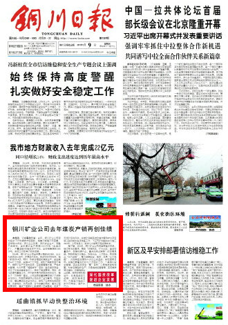 2014年,銅川礦業(yè)公司全年累計(jì)掘進(jìn)56138米,比計(jì)劃多完成1138米。開展技術(shù)攻關(guān),完成科研項(xiàng)目6項(xiàng),推廣新技術(shù)13項(xiàng)。同時(shí),科學(xué)合理組織煤炭生產(chǎn),安全撤回14個(gè)工作面,安裝13個(gè)工作面,做到了搬家倒面不停產(chǎn),確保了生產(chǎn)任務(wù)的完成;在經(jīng)營管理方面,嚴(yán)格成本管理,大力開展“增盈減虧”活動(dòng),盤活庫存資金,成立了機(jī)電設(shè)備維修中心,降低了維修費(fèi)用;同時(shí),深化改革和重組工作,并不斷開展內(nèi)部板塊間的合作,提出了“大格局”理念,公司與西安重裝集團(tuán)簽訂了戰(zhàn)略合作協(xié)議,和陜西煤層氣公司達(dá)成了合作意向,和生態(tài)水泥、建設(shè)集團(tuán)達(dá)成合作協(xié)議,實(shí)現(xiàn)了兄弟板塊抱團(tuán)取暖、共度難關(guān)、共同發(fā)展、合作共贏的局面;重點(diǎn)工程進(jìn)展順利,建成了國家礦山救援銅川區(qū)域基地;完成了玉華礦后溝風(fēng)井、東坡礦運(yùn)輸系統(tǒng)改造方案和PVC項(xiàng)目竣工驗(yàn)收前的各項(xiàng)準(zhǔn)備工作;下石節(jié)礦2#副斜井已施工2013米;公司信息化、數(shù)字化大樓等工程進(jìn)展有序。