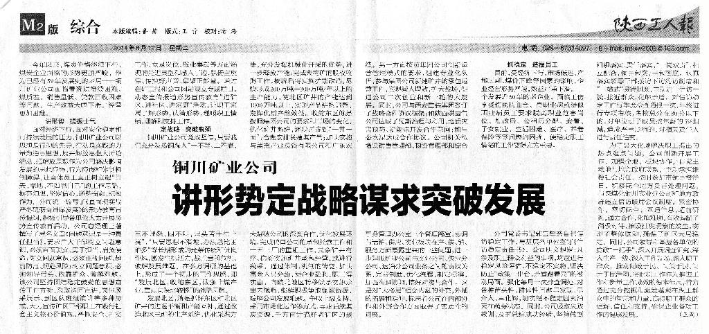【2014年八月在省級(jí)以上媒體刊發(fā)稿件影印圖摘選】 ● 8月12日“陜西工人報(bào)”煤業(yè)二版刊發(fā)《銅川礦業(yè)公司講形勢(shì)定戰(zhàn)略謀求突破發(fā)展》(作者:王莉)