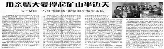 ● 4月1日“陜西工人報”三版刊發(fā)《用親情大愛撐起礦山半邊天--記“全國三八紅旗集體”徐家溝礦嫂服務(wù)隊》(作者:王莉)