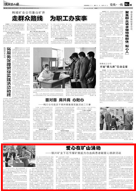 五月花開紅似火,愛心傳遞涌真情。5月8日,銅川礦業(yè)下石節(jié)煤礦掀起了為白血病孩子張卓文捐款獻(xiàn)愛心活動(dòng),全礦職工家屬紛紛慷慨解囊,共捐款5.8余萬元。愛心再一次在礦山涌動(dòng)。