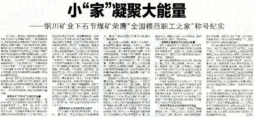 ★ 12月24日“陜西工人報”刊發(fā)《小“家”凝聚大能量—銅川礦業(yè)下石節(jié)煤礦榮膺“全國模范之家” 稱號紀實》(作者:張萍)