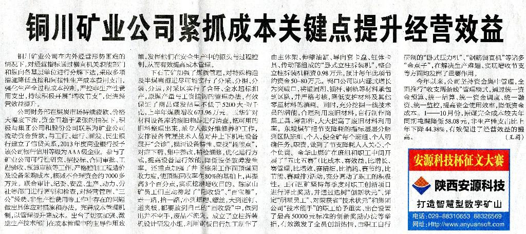 ● 12月17日“陜西工人報”頭版刊發(fā)《銅川礦業(yè)公司緊抓成本關(guān)鍵點提升經(jīng)營效益》(作者:王莉)