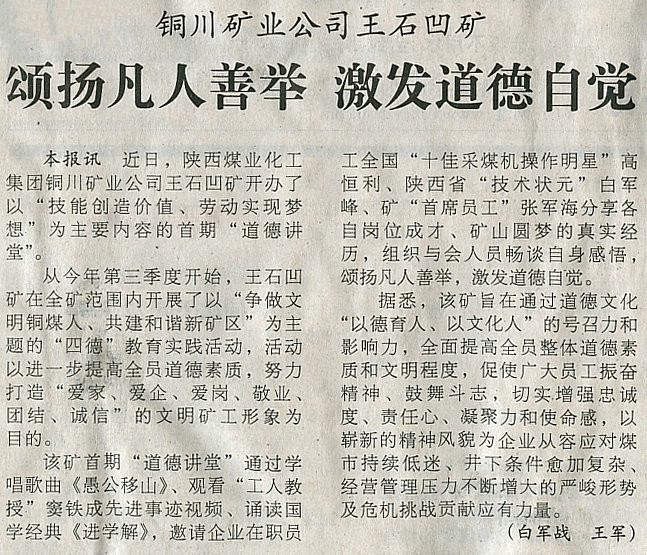●10月25日“中國(guó)煤炭報(bào)”第二版刊發(fā)《銅川礦業(yè)王石凹礦頌揚(yáng)凡人善舉激發(fā)道德自覺》(作者:白軍戰(zhàn) 王軍)