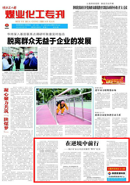 陜西工人報(bào) 2013年10月1日 頭版 從去年開始,一場突如其來而又持久不退的煤市“寒冬”,使全國煤炭市場出現(xiàn)重大逆轉(zhuǎn)。面對(duì)“寒冬”,是苦練內(nèi)功、化危為機(jī),還是等靠要熬、被動(dòng)應(yīng)對(duì)?銅川礦業(yè)公司黨政給出的答案是:依靠管理創(chuàng)新、深挖內(nèi)部潛力,努力在砥礪進(jìn)取中趟出一條逆勢奮進(jìn)的新路子。全員參戰(zhàn)抓好煤質(zhì)這個(gè)命根子