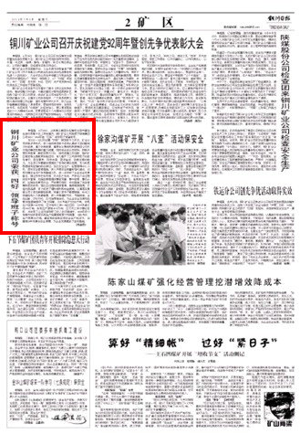 6月28日,從陜煤化集團(tuán)慶祝建黨92周年暨創(chuàng)先爭(zhēng)優(yōu)表彰大會(huì)上傳來(lái)喜訊,銅川礦業(yè)公司被授予陜煤集團(tuán)公司2011—2012年度“四好”領(lǐng)導(dǎo)班子榮譽(yù)稱號(hào)。