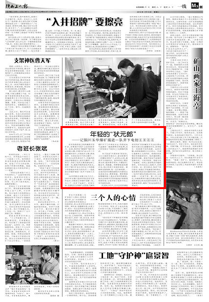 初冬的瑞雪雖已悄然飄落百里礦區(qū),但寒意中的礦山卻熱鬧非凡。此刻,陜西省“銅煤杯”煤礦職業(yè)技能大賽,在銅川礦業(yè)公司三個賽場激烈進行,可謂高手云集、群英薈萃。在如此高水平的比賽中,一名年僅24歲的青年礦工,在激烈的競技中脫穎而出,成為大賽的“一匹黑馬”,榮獲了此次大賽采掘電鉗工組第一名,被授予陜西省技術狀元,首開了銅川礦業(yè)公司歷史上年齡最小的省級技術狀元的先河——他就是玉華煤礦掘進一隊井下電鉗工王江江。24歲的陜北米脂小伙王江江,2009年從銅川技師學院綜采專業(yè)畢業(yè)后,分配到玉華煤礦綜掘一隊,當上了一名井下電鉗工。初來乍到,覺著自己對煤礦已經(jīng)很了解的他,深深感到在學校學習的東西,與煤礦井下工作相差太遠,特別是電氣設備的一般故障辨識和處理,自己甚至鬧出了很多讓工友捧腹的笑話。