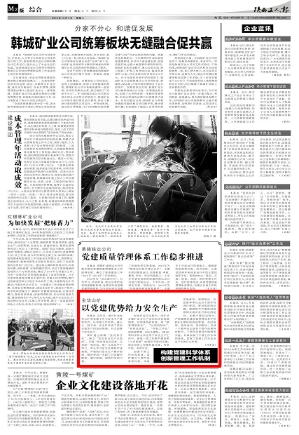 近年來,銅川礦業(yè)金華山礦將黨建工作與安全生產(chǎn)緊密結(jié)合,以黨建工作優(yōu)勢(shì),凝人心、鼓干勁,在全礦形成了抓安全促生產(chǎn)的良好氛圍,有力助推了安全生產(chǎn)。