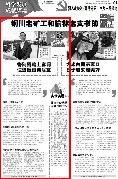 在銅川,當(dāng)了40年礦工的劉順,礦上“先生產(chǎn)后生活”時他不幸福,后來“邊生產(chǎn)邊生活”時他也不幸福,如今他卻顯得幸福感十足。原因是他家住了40年的土磚窯換成了73平米的兩居室。在榆林,當(dāng)了42年村支書的王恩則,剛當(dāng)支書時自家的日子和全村人一樣苦一樣窮,住的是破房子爛窯洞。改革開放后,在他的帶領(lǐng)下全村人大米白面不離口,63戶住上別墅。