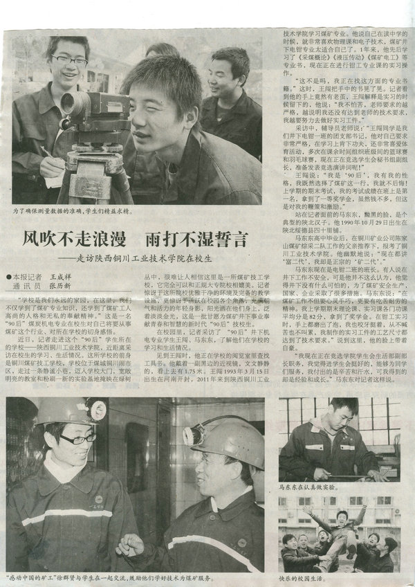 在校園里,記者采訪了 “90后”井下機(jī)電專業(yè)學(xué)生王闖、馬東東,了解他們?cè)趯W(xué)校的學(xué)習(xí)和生活情況。